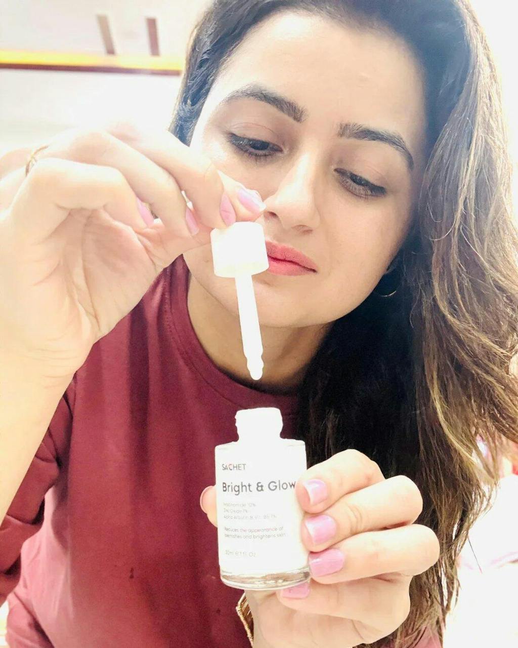 2️⃣ Apply 3–4 drops of Bright & Glow Serum on face and neck.