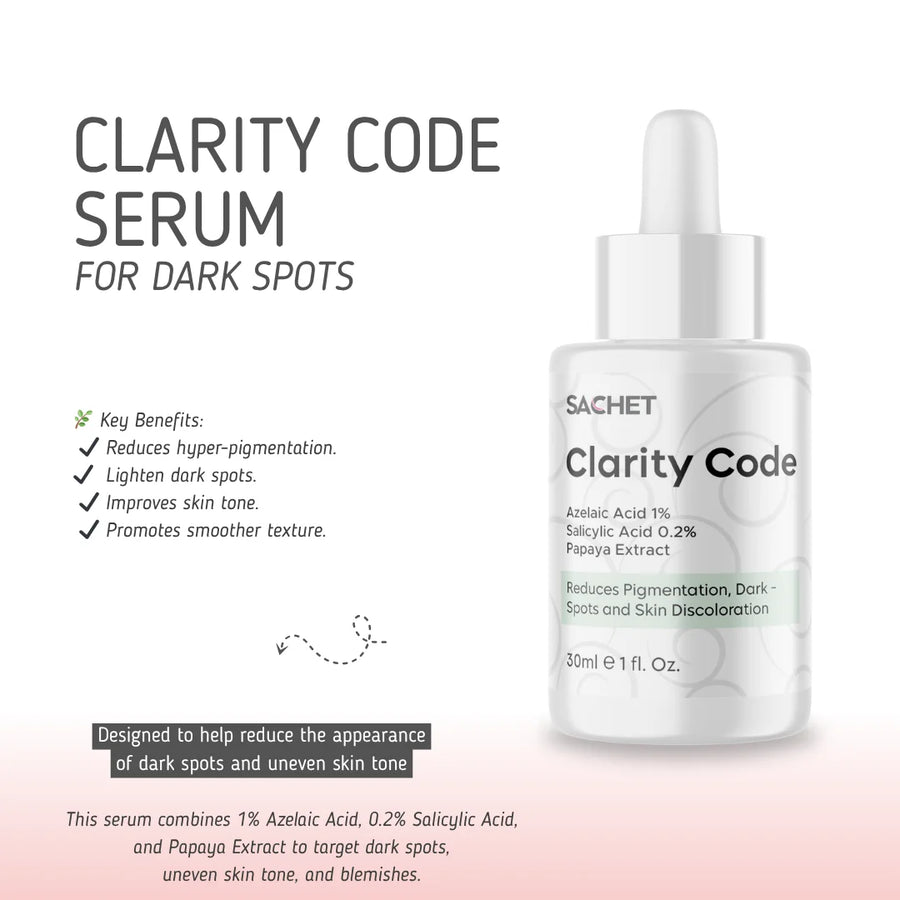 Experience visible skin transformation with SACHET Clarity Code Serum, a lightweight, dermatologist-formulated solution crafted to reduce dark spots, smooth texture, and enhance clarity — made especially for Pakistani skin concerns like pigmentation, blemishes, and post-acne marks.