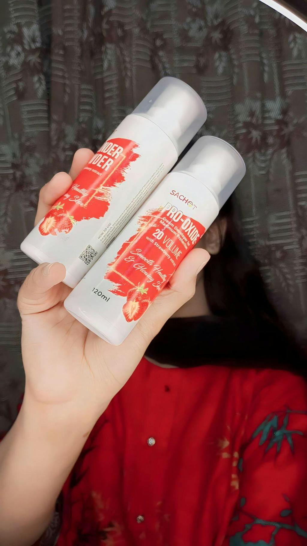 Aqua, hydrogen peroxide, Strawberry extract, cetearyl alcohol, proplyen glycol, glycerine, preservatives, stabilizer and fragrance